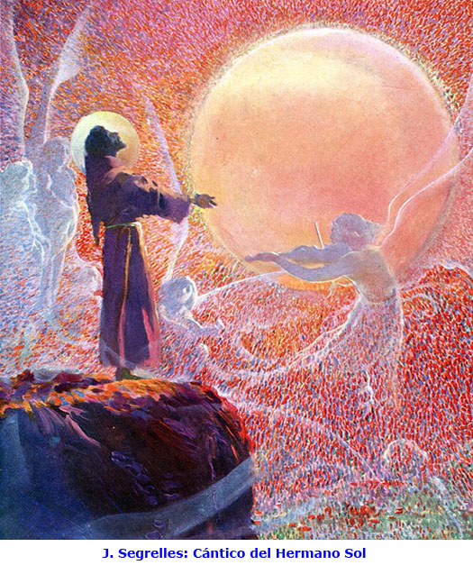 Para entender la prohibición de cortar del todo los árboles, no sólo hay que pensar en Is 11,1, sino también en el hecho de que los árboles le recordaban el árbol de la cruz. Por eso los abrazaba. Las criaturas, sobre todo los corderos y los gusanos, la madera y las piedras, las flores y los árboles, le evocan a Cristo. Le hacen pensar en acontecimientos concretos de la vida del Hijo de Dios hecho hombre. «Esta experiencia inmediata del simbolismo de Cristo, que llega incluso a la compasión con el Señor sufriente en los animales, es quizás un caso único en la historia de la espiritualidad».[9] Esta visión mística, en virtud de la cual Francisco ve a Cristo reflejado en todas las cosas, convierte también al Cántico de las criaturas en un monograma transparente y diáfano de Cristo. Además, el Cántico es una acción de gracias por aquella experiencia mística en la que Dios le prometió a Francisco el reino de los cielos, en recompensa por sus sufrimientos. El Cántico del hermano Sol no nace de un lirismo ni de un misticismo de la naturaleza. Es un himno a Dios, cuya belleza se refleja en la creación y cuyo amor al mundo se manifiesta en la obra redentora de Cristo. Francisco coloca a Cristo en el centro de la creación, como lo hace Pablo en su himno a Cristo: «Todo fue creado por él y para él... Él es el principio, el primogénito de entre los muertos, y así es el primero en todo. Porque en él quiso Dios que residiera toda la plenitud. Y por él quiso reconciliar consigo todos los seres: los del cielo y los de la tierra, haciendo la paz por la sangre de su cruz» (Col 1,17-20). Mediante la obra reconciliadora de Cristo, toda la realidad ha sido fusionada en una fraternidad cósmica. Todos los seres son hijos del mismo y único Padre. Como hermano de todas las criaturas, Francisco quiere alabar y dar gracias a Dios con ellas, por ellas y en nombre de ellas, en una liturgia cósmica. Y traza sobre el mundo entero el signo de la cruz, ese signo mediante el cual el mundo ha sido salvado y bendecido para siempre. Una predicación siempre actual El misticismo de san Francisco no da la espalda al mundo. La relación de Francisco con Dios le hace sensible al bien y al mal del hombre, a sus alegrías y a sus sufrimientos. La alabanza al Creador por sus criaturas contiene también una llamada a los hombres a la conversión. A quienes, por amor de Dios, perdonan, soportan la enfermedad y la tribulación, Francisco les anuncia las bienaventuranzas de Jesús (Mt 5,9-10); en cambio, grita un «¡Ay!» amonestador a quienes mueren en pecado mortal. La estrofa dedicada a la muerte concluye con una palabra de aliento y confianza: Bienaventurados quienes mueren en la voluntad y los mandamientos de Dios, pues no les hará ningún daño el juicio de la condenación, que es la muerte segunda y definitiva. La afirmación de Francisco es una promesa o una advertencia, según sea la situación moral en que se encuentre el oyente. De esta manera, el Cántico es también una llamada, una predicación. De hecho, el texto de la Leyenda de Perusa antes citado atestigua que el Cántico fue pensado como un canto de predicación. Dice, en efecto, la Leyenda:
