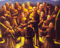 BEATOS Fray Víctor Chumillas nació en Olmeda del Rey, provincia de Cuenca en España, el 28 de julio de 1902. Siendo aún niño, destacó por su religiosidad, laboriosidad y amor a los pobres. Reprendía a los que blasfemaban y predicaba incluso a los adultos. Con frecuencia hablaba de los mártires franciscanos del Japón, y decía: Voy a ser franciscano para irme a misiones y morir mártir, deseo que mantuvo hasta su muerte. Ingresó en el Seminario franciscano, fue ordenado sacerdote y en 1936 se encontraba como superior en el Seminario franciscano de Consuegra (Toledo). Por entonces gozaba ya de fama de santidad. El 24 de julio de 1936, Fray Víctor y sus compañeros fueron expulsados del convento, siendo acogidos en sus casas por familias amigas del pueblo. El 9 de agosto fueron detenidos y encarcelados. La noche del 15 al 16 del mismo mes fueron sacados de la cárcel y conducidos al lugar del martirio. El vicepostulador de la causa nos relata los últimos momentos del padre Chumillas y compañeros con las siguientes palabras: Sin perder tiempo, los milicianos abrieron la parte posterior de la caja del camión y mandaron bajar a los franciscanos. El P. Víctor Chumillas fue el primero en hacerlo y en dirigirse al sitio de la ejecución, en el momento cumbre de su ministerio de Guardián de la comunidad, como el pastor que antecede a su grey en la inmolación. Iba conducido por los milicianos, con las manos atadas y entonando el Libera me, Domine. Los milicianos lo colocaron de espaldas a la carretera, a unos diez metros de ésta, en un rastrojo. Iban bajando serenamente del camión los otros diecinueve franciscanos. Ya en tierra, los verdugos les cacheaban a todos y les quitaban las medallas y objetos religiosos. Después, sin ser llevados, los religiosos se fueron dirigiendo uno a uno a donde estaba el P. Chumillas y poniéndose a continuación unos de otros hasta formar la fila de los veinte, todos de espaldas a la carretera. Como una sola voz, sin quebrarse, y con un solo espíritu, caminaban cantando el Libera me, Domine y lo continuaron en la fila. Los tres coches pequeños que habían escoltado al camión dirigieron sus focos al grupo de las víctimas; además, había luna. A los dirigentes y milicianos se les veía nerviosos, como agarrotados y desconcertados, no atinando a veces a coordinar oportunamente sus pasos y movimientos; en las víctimas, paz, mansedumbre, serenidad y fortaleza admirables, no observadas por el conductor en casi ninguna otra saca; fueron derechos y orando a su inmolación, sin quejas ni reproches a nadie, sin desviarse en intento de huida. Joaquín Arias, el alcalde, colocó a ocho metros de los religiosos al piquete de ejecución, compuesto, al menos, por doce o catorce individuos, y preguntó a aquéllos si querían pedir algo. El P. Víctor le contestó: -Que nos desaten para poder morir con los brazos en cruz como Jesucristo; no tengan miedo, que no escaparemos. Lo denegó el alcalde. Insistió el P. Chumillas: -Que nos fusilen de cara, no de espaldas. Y aquél: -Podéis volveros. Lo hicieron todos. El P. Víctor se dirigió por última vez a su comunidad: -Hermanos, elevad vuestros ojos al cielo y rezad el último padrenuestro, pues dentro de breves momentos estaremos en el Reino de los Cielos. Y perdonad a los que nos van a dar muerte. Intervino Joaquín Arias: -¿Tenéis algo más que decir? Y el P. Guardián: -Estamos dispuestos a morir por Cristo. Como un eco de sus palabras, se oyó una voz enérgica y entusiasta: -Perdónales, Señor, que no saben lo que hacen. Era Fr. Saturnino. Y entonces, las órdenes de rigor: -¡Apunten! ¡Disparen! ¡Fuego! Al tiempo y mezclándose con las primeras descargas, sin un lamento, un coro de veinte voces, vigoroso, vibrante, venciendo la voz de las armas, llenando el valle: -¡Viva Cristo Rey! ¡Viva la Orden Franciscana! ¡Perdónales, Señor! Siguieron los disparos hasta que no quedó en pie ningún religioso. Eran aproximadamente las 3,45 de la madrugada del domingo 16 de agosto de 1936. Sucedía en Boca de Balondillo, término municipal de Fuente el Fresno (Ciudad Real). Realmente aquella pólvora valía mucho: para convertir un campo en santuario, para hacer veinte héroes, veinte nuevos testigos de Dios y de su Cristo, veinte nuevos mártires de la Iglesia: Víctor Chumillas, Ángel Ranera, Domingo Alonso, Martín Lozano, Julián Navío, Benigno Prieto, Marcelino Ovejero, José de Vega, José Álvarez, Andrés Majadas, Santiago Maté, Alfonso Sánchez, Anastasio González, Félix Maroto, Federico Herrera, Antonio Rodrigo, Saturnino Río, Ramón Tejado, Vicente Majadas y Valentín Díez. Seis de ellos eran sacerdotes y catorce estudiantes de teología. Los primeros, excepto el P. Ángel, de 58, tenían entre 29 y 36 años. Los jóvenes, entre 20 y 23. * * * LA DEVOCIÓN MARIANA