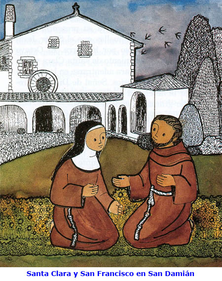ENCUENTRAN A CRISTO Tras el encuentro con el hermano leproso, Francisco estaba preparado para encontrar al Cristo hermano y, precisamente, en el Cristo pobre y crucificado que le miraba con amor desde lo alto de la capilla de San Damián. A partir de aquel momento la enorme capacidad afectiva del joven convertido tendría como centro al divino Redentor, contemplado con asombro amoroso en el anonadamiento de la Encarnación, adorado con gozosa ternura en el establo de Belén, seguido como Pastor y escuchado como Maestro, sobre todo llorado y compadecido, hasta la configuración total, en el sacrificio de la cruz. El primer biógrafo nos ha descrito lo que Jesús era para el Poverello: «Son testigos los hermanos que vivieron con él de cómo cada día y aun cada momento hablaba de Jesús, con qué dulzura y suavidad, con qué ternura y amor lo hacía. De la abundancia del corazón hablaba la boca, y el venero de amor iluminado rebosaba de su pecho a borbotones. Jesús tenía ocupado todo su ser: a Jesús llevaba en el corazón, a Jesús en la boca, a Jesús en los oídos, a Jesús en los ojos, a Jesús en las manos, a Jesús en todos los miembros»... (1 Cel 115). El Cristo que venera y ama Francisco no es sólo el centro de su devoción, sino el Cristo de la fe, contemplado en cada uno de los misterios de su vida, en su glorificación, en la Eucaristía, en la Iglesia, en la creación. Con expresiones que evocan las del evangelio de Juan y las de las cartas de Pablo, celebra al «Hijo del Dios Altísimo», por medio del cual «todo ha sido creado, restaurado, pacificado»; el Padre lo ha mandado al mundo como «salvador y libertador»; es el gran don del Padre, un don que todos nosotros no somos capaces de agradecer como conviene; sólo él, que es la suficiencia del Padre, puede darle gracias dignamente, junto con el Espíritu Santo (1 R 23,5-11). Él es la Sabiduría del Padre, su Palabra, luz verdadera que alumbra nuestro camino, vida y fortaleza nuestra. Cuando Francisco deja hablar a su corazón de enamorado, sin salirse de la andadura bíblica, lo llama esposo, hermano e hijo, ya que «somos sus esposos, sus hermanos, sus madres» (2CtaF 48-56). Se complace en saborear el nombre de Jesús, pronunciándolo con indecible suavidad, pero no olvida que ante ese nombre, que está sobre todo nombre, se dobla toda rodilla en los cielos, en la tierra y en los abismos (Flp 2,9-10). En su carta a la Orden desea a todos los hermanos «salud en aquel que nos redimió y nos lavó en su sangre preciosísima»; y añade: «Al oír su nombre, adoradle con temor y respeto postrados en tierra: es el nombre de nuestro Señor Jesucristo, Hijo del Altísimo, que es bendito por los siglos» (CtaO 3-4). El corazón virginal de la joven Clara se abrió sin esfuerzo al amor del Cristo pobre y crucificado al calor de las exhortaciones de Francisco. Asimiló fielmente los sentimientos y los conceptos de tal maestro, y supo transmitirlos a sus hijas espirituales, especialmente a Inés de Bohemia. Repite, como quien lo ha experimentado místicamente, que nada es comparable a la suerte de ser «esposa, madre y hermana del Señor Jesucristo». Y la apremia a unirse a él en amor inseparable: «Dichosa tú, a quien se concede gozar de este sagrado convite, para poder unirte con todas las fibras de tu corazón a aquel, cuya belleza es la admiración incansable de los bienaventurados; su amor enamora, su vista recrea, su bondad llena, su dulzura sacia, su recuerdo inunda de luz suave; a su perfume resucitarán los muertos y su gloriosa visión hará felices a todos los ciudadanos de la Jerusalén celeste». Luego la invita a mirarse cada día en ese espejo sin mancha, es decir, en la vida toda de Jesús; «en él resplandecen la dichosa pobreza, la santa humildad y la inefable caridad» (cf. 1CtaCl 9ss). [L. Iriarte, Ejercicios espirituales, Valencia 1998, pp. 54-56]