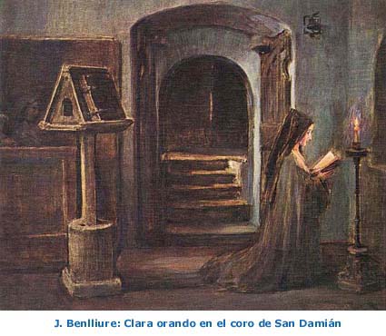 Así como en el trabajo era ejemplo para sus religiosas, lo era también en la vida de oración. Después de las completas, que es la última parte del Oficio divino del día, permanecía largos ratos sola en la iglesia ante aquel Crucifijo que habló a Francisco en otro tiempo y a la luz de la lamparilla solitaria que en todas las iglesias arde y brilla día y noche ante el altar del Smo. Sacramento. Allí se daba a la quieta meditación de los dolores de Cristo y rezaba el «Oficio de la Cruz» que había compuesto Francisco, de quien ella lo había aprendido. Estas prácticas no le impedían levantarse por la mañana muy temprano, la primera de todas; despertaba a las demás, encendía las lámparas y tocaba la campana para la misa primera. De su cuerpo, naturalmente sano y robusto, no se cuidaba mucho ni poco. Su cama en los principios eran haces de sarmiento con un tronco de madera por almohada; después la cambió en un pedazo de cuero y por almohada un áspero cojín; por orden de Francisco se redujo después a dormir en un jergón de paja. En los ayunos de Adviento, de Cuaresma y de San Martín, Clara no se alimentaba sino tres días en la semana, y eso con sólo pan y agua. Francisco y el obispo Guido le mandaron que comiera todos los días por lo menos onza y media de pan. Tal vez para reemplazar esta mortificación observó por largo tiempo la práctica de usar a raíz del cuerpo una camisa de cuero de cerdo con la parte velluda hacia adentro. Después consintió en mudar este vestido por un cinturón lleno de ásperos nudos. Al volver de la iglesia después de haber orado allí por largo rato, su rostro irradiaba felicidad y sus palabras estaban henchidas de alegría. Un día, habiendo oído decir que el agua bendita era símbolo de la sangre de Jesús, quedó tan impresionada, que no cesó hasta la noche de rociar con agua bendita a todas las religiosas, exhortándolas a no olvidar jamás el saludable raudal que mana de las llagas del Salvador. En la tarde de un Jueves Santo fue transportada en éxtasis, del cual no volvió sino pasadas veinticuatro horas. Al volver en sí el viernes por la noche y ver la candela que había encendido una hermana preguntó: «¿Qué necesidad hay de luz? ¿No es de día?» (LCl 31). Una noche de Navidad, estando enferma en cama y no pudiendo por este motivo acompañar en la iglesia a las demás religiosas, oyó todo el Oficio divino que se cantaba en la iglesia del nuevo convento de San Francisco y vio al Niño Jesús reclinado en el pesebre que se había hecho en el fondo de la iglesia (LCl 29). Francisco, a pesar de su humildad, no podía dejar de reconocer cuán grande era la estima en que le tenían Clara y las demás religiosas, y que una parte de sus sentimientos religiosos estaba más o menos vinculada a ese afecto hacia su persona. Con el fin, pues, de ir deshabituando a las Hermanas de esa afección hacia él y para apartar su corazón de todo lo que no era Dios, determinó alejarse de ellas poco a poco e insensiblemente. Sus visitas a San Damián, que al principio habían sido frecuentes, fueron siendo cada vez más raras. Tal proceder chocó a los mismos religiosos, quienes parece que vieron en esto una falta de caridad para con las Hermanas. Francisco entonces les manifestó las razones que a esto le movían y cómo deseaba que de allí en adelante no hubiera intermediario alguno entre Dios y las religiosas. Toda su vida y por todos los medios trató de evitar que en el corazón de la mujer se mezclase alguna afición personal hacia el sacerdote con el puro amor de Dios. «Carísimos -les dijo-, no creáis que no las amo de veras. Pues si fuera culpa cultivarlas en Cristo, ¿no hubiese sido culpa mayor el haberlas unido a Cristo? Y si es cierto que el no haber sido llamadas, para nadie es injuria, digo que es suma crueldad el no ocuparse de ellas una vez que han sido llamadas. Pero os doy ejemplo para que vosotros hagáis también como yo hago» (2 Cel 205). Con todo, un día les prometió que iría a predicar a San Damián. Le gustaba mucho a Clara oír la palabra divina. Sucedió que andando el tiempo el Papa Gregorio IX prohibió a los franciscanos que predicaran en San Damián. A tal prohibición respondió Clara despidiendo a los religiosos que, desde la clausura definitiva prescrita a las clarisas en 1219, se ocupaban en mendigar de puerta en puerta para ellas. «Si podemos privarnos -dijo Clara- del pan espiritual, podemos también vivir sin sustento del cuerpo». Con lo cual el Papa se vio forzado a retirar la prohibición (LCl 37). Así pues, el día en que Francisco, cumpliendo su promesa, iba a predicar a San Damián, las Hermanas estuvieron muy contentas, «no sólo porque iban a tener la dicha de oír la palabra de Dios, sino también porque volvían a ver a su Padre y guía espiritual». Francisco entró a la iglesia y se mantuvo de pie algunos instantes en oración con los ojos elevados al cielo. En seguida, dirigiéndose a la hermana sacristana, le pidió un poco de ceniza. Después, con la misma ceniza trazó un círculo a su alrededor y derramó sobre su cabeza el resto. Sólo entonces rompió el silencio, mas no para predicar, sino para rezar el salmo 50, el Miserere, el salmo de la penitencia. Terminado el rezo, salió de la iglesia y abandonó el monasterio, feliz por haber podido enseñar a las religiosas que él no era más que un miserable pecador vestido de saco y cubierto de ceniza (2 Cel 207). En este mismo orden de ideas se debe contar quizá la escena siguiente que refieren las Florecillas, en la cual aparece como Santa Clara comió con San Francisco y sus compañeros: