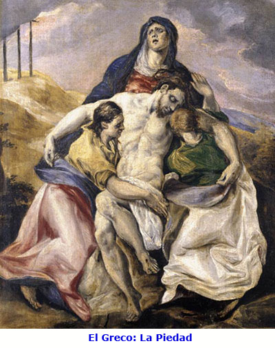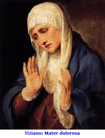 MEDITACIÓN En el momento en que el cuerpo de Jesús es bajado de la cruz y puesto en brazos de la Madre, vuelve a nuestra mente el momento en que María acogió el saludo del ángel Gabriel: «Concebirás en tu seno y darás a luz un hijo, a quien pondrás por nombre Jesús... Y le dará el Señor Dios el trono de David, su padre... y su reino no tendrá fin» (Lc 1,31-33). María sólo dijo: «Hágase en mí según tu palabra» (Lc 1,38), como si desde el principio hubiera querido expresar cuanto estaba viviendo en este momento. En el misterio de la Redención se entrelazan la gracia, esto es, el don de Dios mismo, y «el pago» del corazón humano. En este misterio somos enriquecidos con un Don de lo alto (St 1,17) y al mismo tiempo somos comprados con el rescate del Hijo de Dios (cf. 1 Co 6,20; 7,23; Hch 20,28). Y María, que fue más enriquecida que nadie con estos dones, es también la que paga más. Con su corazón. A este misterio está unida la maravillosa promesa formulada por Simeón cuando la presentación de Jesús en el templo: «Una espada atravesará tu alma para que se descubran los pensamientos de muchos corazones» (Lc 2,35). También esto se cumple. ¡Cuántos corazones humanos se abren ante el corazón de esta Madre que tanto ha pagado! Y Jesús está de nuevo todo él en sus brazos, como lo estaba en el portal de Belén (cf. Lc 2,16), durante la huida a Egipto (cf. Mt 2,14), en Nazaret (cf. Lc 2,39-40). La Piedad. ACLAMACIONES Santa María, Madre de la inmensa