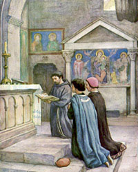 Conviene enmarcar en su contexto histórico cuanto aquí se prescribe. En aquel tiempo se daban frecuentes abusos de sacerdotes que celebraban muchas misas al día por razón del estipendio, y había peligro de que se introdujera este abuso en los lugares donde moraban los frailes, pues ya estaban formadas las fraternidades locales y había muchos sacerdotes. Francisco trata seriamente de excluir dicho peligro. Su argumentación es hermosa y profunda: los frutos del Sacrificio Eucarístico no se perciben por el mero hecho de multiplicar celebraciones, sino conforme a la medida de la caridad fraterna, de la humildad y de la unión con el único Sacerdote, Jesucristo. Francisco no pone en tela de juicio la celebración diaria de la misa, que considera es la práctica existente en los lugares donde moraban frailes, sino que recomienda lo que más apreciaba él, la necesidad de celebrar la Eucaristía como signo genuino de caridad y de unión de los hermanos en Cristo. Dentro de la Liturgia Eucarística se inserta la Liturgia de la Palabra, celebrada actualmente por la Iglesia con el honor debido y profesando a dicha Palabra el mismo culto que al Cuerpo del Señor (cf. Dei Verbum, 2). Así es como pensaba también Francisco, y puso en práctica y predicó con celo esta doctrina. En efecto, siempre que trata de la reverencia al Santísimo Cuerpo y Sangre de Cristo, escribe con idéntico fervor y casi con las mismas expresiones acerca del respeto «hacia los santísimos nombres del Señor y sus palabras escritas». El hecho significativo, relatado por sus biógrafos, de que cuando no podía participar en la misa procuraba que se le leyera el texto evangélico del día (cf. LP 87; EP 117), nos revela en qué grado equiparaba la Palabra con el Sacramento, ya que se sentía tan unido a Cristo cuando oía su Palabra que cuando participaba en el Sacrificio Eucarístico. De ello podemos deducir el sentido pleno con que celebraba la Liturgia y cómo extraía alimento para su vida de oración de las fuentes bíblicas y litúrgicas. b) El Oficio divino El Oficio divino, llamado con más propiedad «Liturgia de las Horas», es otra expresión importante de la vida litúrgica. San Francisco, que concedía un lugar preferente a la adoración, a la alabanza y a la acción de gracias en su oración, pudo penetrar muy a fondo en la razón teológica de esta Liturgia de las Horas (cf. Sacrosanctum Concilium, 83-84). En su vida y en sus escritos se encuentran algunos textos referentes al Oficio divino. Veamos los que son de mayor interés para nosotros. En el capítulo 3 de la Regla bulada manda que se rece el Oficio divino según la forma de la Santa Iglesia Romana (cf. también 1 R 3). Su declaración es firme y severa a este propósito en el Testamento, al igual que en la Carta a toda la Orden, donde dice:
