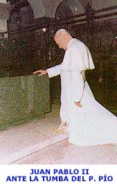 1. Doy las gracias ante todo al padre Flavio Roberto Carraro, ministro general de los Hermanos Menores Capuchinos, por el afectuoso saludo que me ha dirigido también en nombre de toda la familia franciscana, aquí representada en sus cuatro ramas. Grande es mi alegría por este encuentro, por varios motivos. Como sabéis, estos lugares están ligados a recuerdos personales, es decir, a las visitas que hice al padre Pio durante su vida terrena y las que he hecho luego, espiritualmente, después de su muerte, a la tumba. Y, además, siempre es una alegre ocasión para mí encontrar a los hijos de San Francisco, que hoy veo aquí en gran número. Amo mucho la espiritualidad franciscana. Uno de mis primeros viajes apostólicos en Italia fue a la tumba del Padre Seráfico en Asís, y todos ciertamente recordáis la Jornada ecuménica celebrada allí en octubre del año pasado. Me alegro de encontrarme ahora en este templo, dedicado a Santa María de las Gracias. Ciertamente, este lugar sagrado ha conocido, en época reciente, una gran irradiación espiritual gracias a la obra del padre Pio: pero, ¿cómo se ha realizado esta obra, sino por una continua efusión de gracia que ha descendido, a través de María, sobre las multitudes que llegan aquí buscando la paz y el perdón? El padre Pío fue devoto de la Virgen, Madre de los sacerdotes, que desarrolla con ellos una función especial para hacerlos conformes al modelo supremo de su Hijo. 2. El deseo de imitar a Cristo fue particularmente vivo en el padre Pío. Dócil desde niño a la gracia, ya a los quince años recibió de Dios el don de ver claro en su vida. Recordando aquel período, él nos narra: «El puesto seguro, el refugio de paz era la escuadra de la milicia eclesiástica. ¿Y dónde mejor podré servirte, oh Señor, sino en el claustro y bajo la bandera del Pobrecillo de Asís?... Que Jesús me conceda la gracia de ser un hijo menos indigno de San Francisco, que pueda servir de ejemplo a mis hermanos». Y el Señor le escuchó, podemos decir, más allá de sus mismas expectativas. En efecto, como religioso vivió generosamente el ideal de fraile capuchino, como vivió el ideal de sacerdote. Por ello, constituye también hoy un punto de referencia, puesto que en él encuentran especial acogida y resonancia espiritual los dos aspectos que caracterizan el sacerdocio católico: la facultad de consagrar el Cuerpo y la Sangre del Señor y la de perdonar los pecados. ¿Acaso no fueron el altar y el confesonario los dos polos de su vida? Este testimonio sacerdotal contiene un mensaje tan válido como actual. El Sacrificio eucarístico 3. Basta recordar, a este propósito, lo que enseña el Concilio Vaticano II sobre el sacramento del sacerdocio, sobre todo en el Decreto «Presbyterorum ordinis». Este Decreto afirma esos valores esenciales y perennes del sacerdocio, que en el padre Pío se realizaron de un modo excelente. Es cierto que propone nuevas perspectivas también y nuevas formas de testimonio, más adaptadas a la mentalidad de nuestros tiempos. Pero sería un gran error que, por un impulso mal orientado hacia la renovación, el sacerdote olvidase esos valores fundamentales: y ciertamente no puede apelarse al Concilio para justificar tal olvido. Un aspecto esencial del ministerio sagrado, reconocible en la vida del padre Pío, es la ofrenda que el sacerdote hace de sí mismo, en Cristo y con Cristo, como víctima de expiación y de reparación por los pecados de los hombres. El sacerdote debe tener siempre delante de los ojos la definición clásica de la propia misión, contenida en la Carta a los Hebreos: «Todo pontífice es tomado de entre los hombres y está puesto en favor de los hombres en lo que se refiere a Dios para ofrecer dones y sacrificios por los pecados» (Hb 5,1). El Concilio se hace eco de esta definición cuando enseña que «como ministros sagrados, señaladamente en el sacrificio de la Misa, los presbíteros representan a Cristo, que se ofreció a Sí mismo como víctima por la santificación de los hombres» (Decr. Presbyterorum ordinis, 13). Esta ofrenda ha de alcanzar su máxima expresión en la celebración del Sacrificio eucarístico. ¿Y quién no recuerda el fervor con el que el padre Pío revivía, en la Misa, la pasión de Cristo? De aquí la estima que él tenía de la Misa -llamada por él «un misterio tremendo»-, como momento decisivo de la salvación y de la santificación del hombre mediante la participación en los mismos sufrimientos del Crucificado. «En la Misa -decía- está todo el Calvario». La Misa fue para él la «fuente y el culmen», el punto de apoyo y el centro de toda su vida y de toda su obra. El sacramento de la reconciliación y la dirección espiritual 4. Esta íntima y amorosa participación en el Sacrificio de Cristo fue para el padre Pio el origen de la entrega y la disponibilidad en relación con las almas, sobre todo las enredadas en los lazos del pecado y en las angustias de la miseria humana. Es algo tan conocido que no me detendré sobre ello; pero quisiera destacar algunos puntos que me parecen importantes, porque también en ello encontramos que el comportamiento del padre Pío y la enseñanza conciliar coinciden. El humilde religioso acogió con docilidad la infusión de ese «espíritu de gracia y de consejo», del que habla el Concilio, es decir, ese espíritu que debe permitir al Pastor de almas «ayudar y gobernar al Pueblo de Dios con corazón limpio» (cf. Decr. Presbyterorum ordinis, 7). Él se empeñó de un modo particular -según otra enseñanza conciliar (cf. ib., 9)- en la dirección espiritual, prodigándose para ayudar a las almas a descubrir y a valorar los dones y los carismas, que Dios concede cómo y cuándo quiere en su misteriosa liberalidad. También esto puede servir de ejemplo a muchos sacerdotes para reanudar o mejorar un «servicio a los hermanos», tan ligado a su misión específica, que siempre ha sido y todavía hoy debe ser rico en 