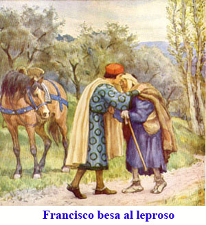 Es la experiencia personal de la trayectoria de la gracia en su conversión. Tal experiencia suele iluminar y gobernar la vida entera del convertido. En san Pablo, el «Yo soy Jesús, a quien tú persigues» (Hch 9,5) fue un rompiente de luz que vivificaría toda su visión teológica del misterio de Cristo Señor, presente en sus miembros los fieles, y acuciaría su celo por el Evangelio sin lugar al reposo. Para Francisco, el hecho de haber llegado al encuentro con Cristo a través del pobre, sobre todo a través del leproso, en quien se unen pobreza y dolor, se proyectaría en su concepción total de la Encarnación y del seguimiento del Cristo hermano. Por temperamento y por sensibilidad cristiana el joven Francisco venía ya inclinado a la piedad para con los indigentes. Un día ocurrió que, en un momento de afanosa atención al mostrador en la tienda de paños, despidió sin limosna a un mendigo. Al caer en la cuenta, reprochóse a sí mismo tamaña descortesía, no tanto hacia el pordiosero cuanto hacia el Señor, en cuyo nombre pedía ayuda. Desde aquel día se propuso no negar nada a quien le pidiera en nombre de Dios (1 Cel 17). Dios, centro de referencia de la caballerosidad depurada del hijo del mercader, iba recibiendo, poco a poco, los rasgos de un rostro familiar: Cristo. Francisco, ganoso de renombre, camina rumbo a Apulia entre los caballeros de Gualtiero de Brienne. Viendo a uno de ellos pobremente vestido, le regala su propia indumentaria flamante «por amor a Cristo». A la noche siguiente tiene el sueño del palacio lleno de arreos militares, completado poco después con otro sueño en que la voz del Señor le disuade de proseguir la expedición (1 Cel 5; 2 Cel 5-6). Vuelto a Asís, experimentó profundo hastío de los devaneos juveniles, mientras veía crecer en su corazón el interés por los pobres y el goce nuevo de sentarse a la mesa rodeado de ellos. Ya no se contentaba con socorrerles, «gustaba de verlos y oírlos». El gesto burgués de remediar la necesidad del hermano con un puñado de dinero lo hallaba absurdo. Mientras subsiste, en efecto, la desigualdad derivada del nacimiento o de la fortuna, el amor al prójimo no sazona evangélicamente. Más que dar, es preciso darse, ponerse al nivel del pobre. Y Francisco anhelaba experimentar qué es ser pobre, qué es vestir unos andrajos, el sonrojo de tender la mano implorando la caridad pública (TC 10). La ocasión se le presentó a la medida de sus deseos en una peregrinación que hizo a Roma. A la puerta de la basílica de San Pedro cambió sus vestidos con los harapos de uno de los muchos mendigos que allí se agolpaban; colocado en medio de ellos pedía limosna en francés (2 Cel 8; TC 10). El francés, o más exactamente el provenzal, lengua de trovadores, era la que usaba Francisco cuando, en momentos de exaltación espiritual, afloraba su alma juglaresca (2 Cel 12). Tenía ahora la experiencia de la pobreza real, la del pobre, que es, al mismo tiempo humillación, inferioridad, falta de promoción pública y, a veces, degeneración física y moral. La experiencia decisiva, la que le hizo dar la vuelta, valga la expresión, bajo el acoso de la gracia, fue la de los leprosos. Toda la naturaleza de Francisco, delicada, hecha al refinamiento, se revolvía al espectáculo de las carnes putrefactas de un leproso (1 Cel 17; 2 Cel 9; TC 11). Era el momento de dar a Cristo la prueba decisiva de su disponibilidad para «conocer su voluntad». Primero fue el vencimiento con el leproso que le salió al camino en la llanura de Asís: apeóse del caballo, puso la limosna en la mano del leproso y se la besó; el leproso, a su vez, apretó contra sus labios la mano del bienhechor (1 Cel 17). Pocos días después buscaba él mismo la experiencia dirigiéndose al lazareto para hacer lo propio con cada uno de los leprosos. El relato de los Tres Compañeros, que parece haber recogido con mayor fidelidad los recuerdos personales de Francisco, después de una alusión expresa al obstáculo que hasta entonces le había impedido acercarse a los leprosos -sus pecados-, añade una observación preciosa en relación con el proceso de la conversión: «Estas visitas a los leprosos acrecentaban su bondad» (TC 12). 2) Francisco descubre al Cristo hermano