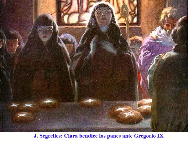 Como Francisco, y con sus mismas palabras, expresa en la Regla su total y confiada obediencia a la sede de Pedro: «Clara, indigna sierva de Cristo y plantita del beatísimo padre Francisco, promete obediencia y reverencia al señor papa Inocencio y a sus sucesores, elegidos canónicamente, y a la Iglesia romana» (RCl 1,3). Y también ella quiere un cardenal protector, como garantía de la fidelidad al compromiso de pobreza absoluta y al Evangelio (RCl 12,12-13). Tampoco para Clara resultó siempre fácil ni sencilla esa sumisión total a la santa madre Iglesia. Un primer momento duro fue el de tener que aceptar, con la Regla benedictina, la autoridad y el título de abadesa, «casi obligada por san Francisco» (Proceso 1,6). Otro segundo momento se produjo durante el viaje de Francisco a Oriente, cuando le fue asignado un visitador cisterciense: la santa recurrió animosamente al papa y obtuvo que fuera sustituido por Felipe Longo, el hermano de plena confianza suya, al que luego sucedió el hermano Pacífico.[15] Más delicada fue la resistencia, si se la puede llamar así, frente al papa Gregorio IX, que trató reiteradamente de convencerla de la necesidad de aceptar posesiones y rentas. Leemos en la Leyenda: «El señor papa Gregorio..., que profesaba a la santa profundo afecto paterno, hizo cuanto pudo por convencerla de que se aviniera a aceptar algunas propiedades... Pero ella se opuso con decisión inquebrantable y por ninguna razón se dejó persuadir. Y cuando el pontífice le replicó: "Si es el voto lo que te lo impide, Nos te desligamos de ese voto", ella respondió: "Santo Padre, por nada del mundo quiero jamás ser dispensada del seguimiento de Cristo"» (LCl 14; cf. Proceso 1,13; 2,22; 3,14). Finalmente venció, y obtuvo del mismo papa la confirmación del Privilegium paupertatis, concedido la primera vez por Inocencio III. Siguió afirmando, con tenacidad y suavidad, la sagrada herencia recibida de san Francisco, hasta que logró dejar a sus hermanas una regla tal como ella la deseaba, plenamente evangélica; y no se contentó con la aprobación del cardenal protector, por más que éste la había concedido «con autoridad del señor papa», sino que quiso tenerla del mismo sumo pontífice Inocencio IV; y murió feliz, después de besar repetidas veces la bula pontificia con el texto de la Regla.[16] Gregorio IX, ya lo hemos visto, sentía por Clara un afecto que era más bien veneración. Por la Leyenda sabemos que «tenía una confianza extraordinaria en las oraciones de la santa, habiendo experimentado más de una vez su eficacia; con frecuencia, al sobrevenir alguna dificultad, sea en los tiempos en que fue obispo de Ostia, sea después de ser elevado a la suprema potestad apostólica, se dirigía a ella suplicante, por carta, para pedirle la ayuda de su oración» (LCl 27). De estas cartas se conservan dos, una de cuando era cardenal Hugolino, la otra siendo papa. La primera, escrita probablemente en 1220, a raíz de una visita a San Damián -tal vez con la delicada ocasión arriba indicada- está llena de humildad y de veneración. La segunda, escrita en 1228, vale por un tratado de teología de la vida contemplativa. Después de una consideración sobre el sentido de su vocación, dice a Clara y a las hermanas: «Entre las innumerables amarguras e infinitas angustias, que sin cesar nos afligen, vosotras sois nuestro consuelo. Por eso os rogamos a todas, y os exhortamos en el Señor Jesucristo, y, por este escrito apostólico, os mandamos que, andando y viviendo según el espíritu, ... compitáis en desear los mejores carismas... Y ya que sois un solo espíritu con Cristo, os pedimos que en vuestras oraciones os acordéis siempre de Nos y elevéis vuestras manos hacia Dios, suplicándole con insistencia a fin de que ... nos robustezca con su virtud y nos conceda cumplir dignamente el ministerio que nos ha confiado, de modo que sea para su gloria, gozo de los ángeles y bien nuestro y de todos los que están confiados a nuestro gobierno».[17] Así pues, San Damián no era solamente el lugar de oración que ofrecía seguridad a los habitantes de Asís, como lo atestigua el proceso, sino también y sobre todo un compromiso constante de santificación y de intercesión por el sumo pontífice y por toda la Iglesia. Clara era consciente de semejante misión; la hallamos formulada, con una expresión de precisión paulina, en una de sus cartas a Inés de Praga: «Para servirme de las mismas palabras del apóstol (1 Cor 3,9), te considero colaboradora del mismo Dios y sostén de los miembros vacilantes de su Cuerpo inefable» (3CtaCl 8). Dos textos suyos, uno del Testamento y otro de la Bendición, nos descubren quizá cierta pedagogía eclesial usada con las hermanas para estimularlas a la fidelidad en los compromisos asumidos: toda infidelidad nuestra «es como una injuria a la iglesia triunfante y aun a la Iglesia militante»; de igual modo que la respuesta generosa a Dios atrae sus bendiciones sobre la Iglesia militante y acrecienta la gloria de la Iglesia triunfante (TestCl 74-75; BenCl 8-10). El antiguo biógrafo describe el júbilo de la santa cuando, en el lecho de muerte, recibió la visita de Inocencio IV: el papa, entrado en el monasterio, se dirige al pequeño camastro y le da a besar la mano; ella quiere besarle también el pie; después le pide la remisión de todos sus pecados. Cuando todos se han ido, levantando los ojos al cielo y con las manos juntas, dice llorando de consuelo: «Alabad al Señor, hijas mías, porque hoy Cristo se ha dignado hacerme un don tan grande, que cielo y tierra no podrían pagarlo: ¡hoy he recibido a él mismo, el Altísimo (en la comunión) y he merecido ver a su Vicario!» (LCl 41-42). NOTAS: [1] Pueden verse varios estudios sobre el tema en San Francisco de Asís y la Eucaristía.- Octave d'Angers, La messe publique et privée dans la pieté de saint François, en Études Franciscaines 49 (1937) 475-486; B. Cornet, Le «De