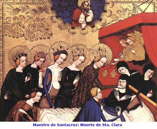 Santa Clara, que había invocado sobre sus hermanas pobres, en el Testamento y en la Bendición última, la protección de María, tuvo el consuelo de ser visitada por la Virgen de las vírgenes, acompañada de un coro de santas vírgenes: la envolvió con un velo blanco finísimo y la besó dulcemente, tres días antes de su muerte, según la visión tenida por sor Benvenuta: