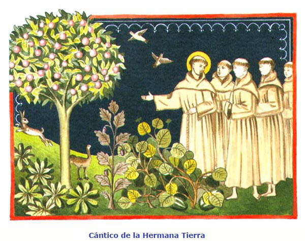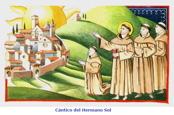 Sólo cuando uno ha llegado a sentir ese cambio, sólo el convertido, está en disposición de elevarse a Dios desde las criaturas y de hallar en éstas un medio de liberación y no un estorbo en el camino. A Francisco le vemos muchas veces inundado de gozo ante la creación hermana y bendiciendo a Dios por ella, pero ni una sola vez nos lo han presentado sus biógrafos abandonándose al goce de las cosas bellas y agradables; y no por el miedo ascético al peligro que puede venirle de las mismas, sino porque detenerse egoístamente en lo que tienen de placentero es un género de «apropiación», un atentado contra la libertad con que ellas deben pregonar la bondad del Dios Altísimo, de quien es todo bien: «Vamos a dar permiso a la hermana cigarra -dijo el bienaventurado Francisco- para que vaya a donde quiera. Nos ha consolado bastante. Y podría ser ocasión de vanagloria para nuestra carne».[2] No lo hubiera sufrido ni su sensibilidad ni su fe retener prisionero en la jaula, por propio entretenimiento, un pajarillo, creado para vivir y cantar libre en la enramada; ni cortar una flor, hecha para alegrar el espacio con perfumes y colores, para solazarse él privadamente. Daba libertad siempre que podía aun a los animalitos destinados a servir de alimento. Sabido es que, precisamente, ese respeto del Poverello a la naturaleza, individualizada en tantos hermanos y hermanas cuantos son los seres con derecho a la existencia y a la libertad, es lo que le ha merecido el ser declarado Patrono de los ecologistas. El breve pontificio, que lo proclamó como tal en 1979, fue promulgado a petición de las sociedades ecologistas.[3] EL CÁNTICO DE LAS CRIATURAS[4] Al leer el maravilloso Cántico de las Criaturas o del Hermano Sol, creeríamos que salió del alma del santo trovador en una mañana radiante, cuando la belleza de la naturaleza se le metía por los ojos, por los oídos, por todo su ser, embriagándole de dulzura; y nos lo imaginamos rebosante de bienestar, cantando al Hacedor por el agrado que ha puesto en las cosas para servicio y satisfacción del hombre. Pero la realidad fue muy otra. El Poverello, copia viva del Crucificado con sus miembros llagados, iba acercándose al final de su vida. Ya no podía tener en pie aquel cuerpo dolorido, atormentado de enfermedades y de pesadumbres, probado largamente en el seguimiento amante del Redentor. Estaba ciego. Para él ya no lucía aquel Sol hermano. La luz le atormentaba; le atormentaban las voces, los rumores: le atormentaban todas las criaturas. Clara le había hecho construir una choza en el huerto de San Damián; allí, después de cincuenta días sin hallar reposo por el fuerte dolor de los ojos, pasó una noche malísima, con dolores corporales y angustias espirituales. No parecía sino que toda la creación de Dios se daba cita para hacerle sufrir; hasta se añadieron los ratones, corriendo a bandadas por encima de sus miembros enfermos. Y fue entonces cuando, llegada por fin la mañana, llamó a sus compañeros y, como en un éxtasis de amor y de gozo, los fue enseñando a cantar: Altísimo, omnipotente, Señor bueno... Loado seas, mi Señor, con todas tus creaturas... (cf. LP 83; EP 120). Añaden los «tres compañeros», testigos inmediatos, que desde entonces, en los momentos de mayor recrudecimiento de los dolores corporales, se hacía cantar el Cántico del Hermano Sol con melodía compuesta por él mismo, «para poder apartar la atención de la acerbidad de los dolores mediante el gusto de las alabanzas del Señor; y así hasta el día de su muerte (LP 83). Es la culminación de una vida toda ella penitencial, sostenida por un amor purificante. Francisco pudo captar y celebrar cuanto hay de bello, de bueno y de útil en las cosas, precisamente porque su corazón se había liberado de todo acaparamiento posesivo. Todo ser creado le resulta amable aun cuando, para él, se convierte en fuente de sufrimiento. Quien mira la creación como objeto de goce o de pura utilización no llegará nunca a entenderla. Pero también este hallazgo temió apropiárselo si se lo reservaba para sí solo. Había que hacer de él un medio de servicio fraterno a los hombres. Su mensaje de paz, embajada de amor y alegría, había que decirlo cantando, con el arte de la gaya ciencia, que entonces hallaba acogida siempre favorable en todos los ánimos. Los hermanos menores debían ser los juglares de Dios, y ayudarían a los hombres, inmersos en los afanes terrenos y faltos de perspectiva para percibir el concierto de las cosas, a captar la voz encerrada en cada una, saber usarlas con respeto y con sentimiento de hermandad, con gratitud rendida al Creador, porque son bellas y útiles. Tenía la seguridad de que así los hombres se sentirían más hermanos (cf. LP 83). Y sucedió que, cuando ya tenía compuesta su canción y preparado su equipo de juglares de Dios, a las órdenes de fray Pacífico, el «trovador laureado», se trabaron en una enemistad escandalosa el obispo y el podestá de Asís. Entonces Francisco añadió una estrofa que comenzaba así: Loado seas, mi Señor, por aquellos que perdonan por tu amor, y envió a sus juglares a cantar todo el cántico ante las dos autoridades reunidas con sus comitivas. Obispo y podestá terminaron por abrazarse conmovidos, y la paz fue restablecida (LP 84). También para Clara y sus hermanas compuso Francisco un mensaje con canto sobre el tema de la caridad mutua y de la unión de corazones, y lo hizo cantar al grupo de hermanos cantores; es el Audite, poverelle (LP 85). El alma de Clara, por lo demás, fue también en esto exacta resonancia de la de Francisco, aun estando alejada, en su retiro, de las bellezas creadas. Así lo declara una testigo del Proceso de canonización: