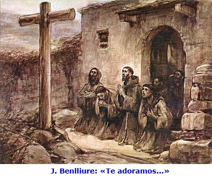 El más mínimo indicio de una cruz impulsa a Francisco y a sus compañeros a la adoración; su «liturgia» no está limitada a un lugar de culto. La ampliación de la fórmula litúrgica de adoración se corresponde con la dilatación del espacio litúrgico. El mundo se convierte en lugar de adoración.[2] En el «Te adoramos», que los hermanos recitaban en las iglesias y en plena naturaleza, resuena ya la liturgia cósmica que el Cántico del hermano Sol desarrollará más tarde. 3. La tercera adición es el adjetivo « santa»: por tu santa cruz. Este tercer añadido nos brinda una nueva clave para comprender el «Te adoramos». Para Francisco, la cruz es santa, como son santos los nombres del Señor y sus palabras escritas: «los santísimos nombres y sus palabras escritas» (Test 12). Por eso, la adora dondequiera que la ve, e incluso cuando lo que se le presenta ante la vista es sólo un indicio o un esbozo de cruz. La cruz es santa: por eso considera santo el mandamiento recibido del Crucifijo de San Damián. Adviértase, por otra parte, que durante los primeros años de la Fraternidad, el «Te adoramos» se centra exclusivamente en la cruz. Pero la reforma del Concilio IV de Letrán (1215) promovió también el culto de la eucaristía[3] y, de otro lado, en 1224 Honorio III concedió a los hermanos menores el poder tener altares portátiles e iglesias propias.[4] Por influencia de estos hechos, y paralelamente con la «cruzada eucarística» de Francisco y de Honorio III,[5] la fórmula de adoración de la cruz quedará marcada e interpretada en clave eucarística, y se referirá al misterio de la salvación en la cruz y en el altar.[6] DIFUSIÓN DEL «TE ADORAMOS» Francisco asimiló profundamente esta fórmula de adoración de la cruz. Y la transmitió a sus primeros compañeros, exhortándoles a recitarla con frecuencia. En efecto, la Leyenda de los tres compañeros y Celano relatan que, en los comienzos de la Orden, época en la que los hermanos carecían de breviarios y todavía no rezaban el oficio divino, Francisco les mandó recitar el «Te adoramos»: