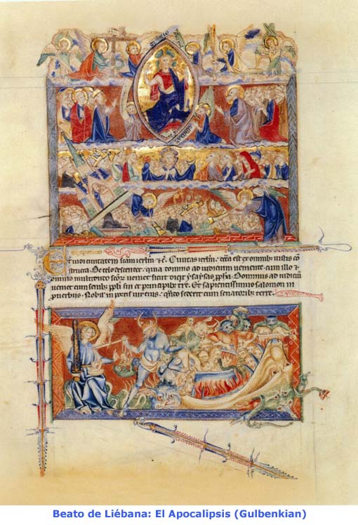 virtud de la sangre del Cordero ¡Ay de la tierra y del mar!, porque el Diablo ha bajado donde vosotros con gran furor, sabiendo que le queda poco tiempo.] * * * Cantos de júbilo por el establecimiento del reino de Dios (Ap 11,15-19). Estamos en el Apocalipsis. Como solemnemente lo anunció el ángel en 10,7, la séptima trompeta señala el momento en que se hará efectivo el misterioso plan de Dios sobre el mundo, que culmina con el establecimiento del reino de Dios en él. Lo que en el cielo se ha decidido es inmutable y no dejará de cumplirse. Por eso las milicias celestiales celebran el acontecimiento con himnos triunfales, como si ya se hubiera cumplido. El primer himno, cantado por coros angélicos (v. 15), celebra en pocas palabras el hecho de que el dominio del mundo ha pasado a manos de Dios y de su ungido, el Mesías, y en su poder quedará eternamente. Dios, como criador que es del mundo, es también su señor; pero hasta ahora su señorío no era ilimitado. A su lado, en efecto, y no sin su consentimiento, potencias adversas a Dios ejercían en el mundo cierto poder maléfico, organizado por Satán, a quien el NT llega hasta llamar señor y dios de este mundo (Jn 12,31). Este estado de cosas ha terminado ya. En el segundo canto (vv. 16-17), los ancianos agradecen a Dios el haber hecho por fin uso del gran poder de que dispone, para hacer efectiva su soberanía, poniendo así término al largo y funesto período en que, con longanimidad y paciencia increíbles, dejó obrar libremente a las fuerzas del mal. Esta decisión había provocado la furia de los pueblos paganos (v. 18), que, siendo vasallos de las potencias hostiles a Dios, no quisieron plegarse a aceptar la soberanía divina. Su cólera y furor se manifiestan en el intento de aniquilar a la Iglesia de Dios (cap. 13) y en el ataque insensato que sus ejércitos lanzan contra el propio Dios y contra su ungido, como también contra el «campamento de los santos y la ciudad amada» (Ap 20,9). Pero precisamente su actitud ha hecho estallar contra ellos la ira de Dios y lo ha movido a intervenir en persona para castigarlos. Tras este castigo llega la hora de juzgar a los muertos, cuando todos los fieles servidores de Dios son llamados a recibir su recompensa y cuando también los que arruinaban la tierra encuentran el bien merecido castigo. Se comprende entonces por qué el canto de los ancianos, que hace eco a los salmos mesiánicos 2,1.5 y 99,1, se expresa, proféticamente, como si el hecho escatológico se hubiera ya cumplido. Esto explica también el que en la fórmula descriptiva del ser divino, aquí como en 16,5, se le diga «el que eres y el que eras» y falte el tercer miembro, «el que viene». Himno a Dios y a su Ungido tras la derrota del Dragón (Ap 12,7-12). La escena que se describe en este capítulo 12 es una de las más maravillosas del Apocalipsis. El vidente contempla en la mujer circundada de luz a una figura de grandeza y esplendor sobrenatural. En agudo contraste con ella aparece el dragón, símbolo de las tenebrosas fuerzas del mal y de la perfidia diabólica. La mujer lleva un niño en su seno, y le ha llegado la hora de darlo a luz; cuando lo dio a luz, el dragón quiso devorarlo, pero el hijo fue arrebatado hasta el trono de Dios y la mujer huyó al desierto. Entonces se trabó en el cielo una batalla entre Miguel y el dragón, que fue derrotado y arrojado a la tierra con todos sus secuaces. La mejor ilustración de esta escena se halla en dos declaraciones del Señor. En Lc 10,18 dice Jesús: «Yo estaba viendo a Satán caer del cielo como un rayo», queriendo decir con esto que por obra suya Satán fue despojado de su poder. En Jn 12,31 dice: «Ahora tiene lugar el juicio de este mundo; ahora el príncipe de este mundo será arrojado fuera». El juicio del mundo hostil a Dios, iniciado ya con el ministerio público, llega a su punto culminante en la muerte de Jesús. Así, pues, la victoria de Jesús de que aquí se habla es su muerte. Se declara así perfectamente el sentido exacto de este pasaje: la exaltación del Mesías a la diestra de Dios, recompensa de su obra en la tierra y de su muerte, representa la primera decisiva victoria sobre Satán; con ella su poder se ve destruido en principio o, para usar el lenguaje del Apocalipsis, queda limitado a la tierra y a un determinado espacio de tiempo (v. 12). Cuál haya sido la importancia de la victoria obtenida, se desprende de los nombres que el vidente acumula para ponderar la peligrosidad del vencido. Es «la antigua serpiente», que indujo a pecar a la primera pareja humana, es el «diablo-satanás», o adversario de los hombres, el seductor de todo el mundo. A la caída del dragón, el cielo prorrumpe en un himno que celebra la importancia de lo sucedido (v. 10). La victoria de Miguel sobre Satán es el principio de su derrota definitiva, y por eso bien se puede decir que con ella se ha inaugurado el dominio de Dios y de su ungido. Al ser arrojado del cielo, Satán se ve despojado de la posición influyente que hasta ahora ha tenido ante Dios. Según el AT y el judaísmo contemporáneo de Cristo, Satán no es un ángel caído, sino un miembro de la corte divina, donde tiene la función de «fiscal» o acusador de los hombres ante Dios. Tal aparece en el libro de Job (1,1ss), y sobre todo en el de Zacarías (3,1ss), donde acusa al sumo sacerdote Josué. También para el Apocalipsis Satán ocupa un puesto en el cielo, donde actúa como censor, acusando ininterrumpidamente a nuestros hermanos (los justos) de infidelidad delante de Dios y sometiéndolos a duras pruebas (Lc 22,31). Pero en el NT en general, Satán es un personaje esencialmente hostil a Dios; es exactamente el polo opuesto a Dios. El triunfo de Miguel es al mismo tiempo el triunfo de los hermanos de aquellos que cantan en el cielo (v. 11). Con la caída de Satán se les dio también a ellos la posibilidad de humillar a quien antes era su acusador, de rechazar victoriosamente to