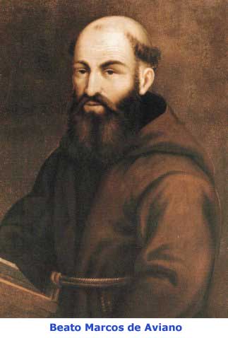 El clima épico de guerra que se libraba por entonces entre la República de Venecia y el Imperio turco influyó decisivamente en la vida del joven Carlo. Impulsado por el deseo de dar su vida por la defensa de la fe, abandonó el colegio de Gorizia y se dirigió a Capodistria. Allí, agobiado por el hambre y las fatigas del viaje, llamó a la puerta del convento de los capuchinos. El superior, además de darle comida y alojamiento, le aconsejó que volviera cuanto antes a la casa de sus padres. Durante la breve permanencia con los capuchinos de Capodistria, iluminado por la gracia, descubrió que podía realizar de modo diferente su vocación al apostolado y al martirio. Así, decidió abrazar la austera vida capuchina. En septiembre de 1648 entró en el noviciado de Conegliano y el 21 de noviembre de 1649 emitió la profesión religiosa con el nombre de Marco de Aviano. Después de los estudios de filosofía y teología, el 18 de septiembre de 1655 fue ordenado sacerdote en Chioggia. Destacó por su intensa oración y por su fidelidad a la vida común, vivida en la humildad y el ocultamiento, y animada por el celo y la observancia de las reglas y constituciones de la Orden. Desde el año 1664, en el que obtuvo el «carné de predicación», dedicó todas sus energías al apostolado de la palabra por toda Italia, principalmente en los tiempos fuertes de Cuaresma y Adviento. También desempeñó cargos de gobierno: en 1672 fue elegido superior del convento de Belluno, y en 1674 fue nombrado director de la fraternidad de Oderzo. El 8 de septiembre de 1676, fue enviado a predicar al monasterio de San Prosdócimo, en Padua. Allí, por su oración y su bendición, se curó de instantáneamente la monja Vincenza Francesconi, que desde hacía trece años yacía enferma en cama. También en Venecia, un mes después, se verificaron acontecimientos extraordinarios parecidos, de forma que comenzó a difundirse por doquier su fama de santidad y cobró más crédito su predicación. Sin turbarse por ello, prosiguió con sencillez su apostolado de la palabra. En especial, exhortaba a sus oyentes a incrementar su vida de fe y su vivencia cristiana, a arrepentirse de sus pecados y hacer penitencia. La noticia de sus milagros y curaciones extraordinarias hizo que fuera cada vez más requerida su presencia, especialmente por reyes y soberanos. En sus últimos veinte años de vida tuvo que realizar, por obediencia a sus superiores de la Orden o a la Santa Sede, fatigosos viajes apostólicos por toda Europa. Mantuvo una relación especial con el emperador Leopoldo I de Austria, a cuya corte tuvo que dirigirse catorce veces, sobre todo en los meses de verano. Participó activamente en la cruzada anti-turca en calidad de legado pontificio y de misionero apostólico. Contribuyó de manera decisiva a la liberación de Viena del asedio turco, el 12 de septiembre de 1683. De 1683 a 1689 tomó parte en las campañas militares de defensa y liberación de Buda, el 2 de septiembre de 1686, y de Belgrado, el 6 de septiembre de 1688. Favorecía la armonía dentro del ejército imperial, exhortaba a todos a una auténtica conducta cristiana y asistía espiritualmente a los soldados. En los años siguientes realizó una gran actividad para restablecer la paz en Europa, sobre todo entre Francia y el Imperio, y para promover la unidad de las potencias católicas con vistas a la defensa de la fe, siempre amenazada por los turcos. En mayo de 1699 emprendió su último viaje hacia la capital del Imperio. Su salud, ya frágil, se deterioró cada vez más, hasta el punto de que tuvo que interrumpir toda actividad. El 2 de agosto recibió en el convento la visita de la familia imperial y, a continuación, la de los más ilustres personajes de Viena. Diez días después, el nuncio apostólico le llevó personalmente la bendición apostólica del Papa Inocencio XII. Recibió los últimos sacramentos y renovó su profesión religiosa. Murió el 13 de agosto de 1699, apretando entre sus manos el crucifijo, asistido por sus augustos amigos el emperador Leopoldo y la emperatriz Eleonora. Lo beatificó Juan Pablo II el 27 de abril del año 2003. [L'Osservatore Romano, edición semanal en lengua española, del 25-IV-03] * * * Marcos de Aviano (1631-1699) El Beato Marcos de Aviano nació en Aviano (Udine) el 17 de noviembre de 1631, del distinguido matrimonio formado por Marco Cristofori y Rosa Zanoni; en el bautismo se le impuso el nombre de Carlos Domingo. La primera instrucción la recibió de un preceptor particular, y a la edad conveniente sus padres lo confiaron al colegio de los jesuitas de Gorizia. El muchacho, de carácter tímido y soñador, se dejó llevar de su entusiasmo, y un día, a la vuelta de un paseo con sus compañeros, resultó que faltaba al pasar lista: se había escapado para ir a convertir a los Turcos. Después de dos días de caminata vino a llamar, agotado, a la puerta de los capuchinos de Capodistria. Aquella crisis de juventud desembocó en la vocación al claustro que Dios le proponía, y el 21 de noviembre de 1648 vistió el hábito en el noviciado de Conegliano, cambiando el nombre de bautismo por el de Marcos. Tuvo que vencer dificultades; una de ellas el que los superiores no pensaban, en un primer momento, admitirlo a los estudios. La intuición de Fortunato de Cadore, más tarde ministro general, fue la que abrió al joven religioso el camino de la cultura, que para él no era nada fácil. Recibida la ordenación sacerdotal el 18 de septiembre de 1655, comenzó al punto, con sus miedos, el apostolado de la palabra. En 1670 fue nombrado superior del convento de Belluno, y dos años después del de Oderzo. El peso de la responsabilidad era un obstáculo para su profundo deseo de soledad y oración. Por ello los superiores, acogiendo su petición, lo trasladaron a Padua. Y allí ocurrió que un panegírico que por obediencia hubo de pronunciar el siervo de Dios, fue la revelación para el público de la