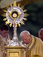 1) La Eucaristía acrecienta y exige nuestra unión con Cristo. Dijo el Señor: «Quien come mi carne y bebe mi sangre, habita en mí y yo en él. Lo mismo que me ha enviado el Padre, que vive, y yo vivo por el Padre, también el que me coma vivirá por mí» (Jn 6,56-57). La Eucaristía causa, pues, una doble inhabitación, Jesús en mí y yo en él, y una compenetración que me permite ser como una prolongación o imagen transparente de Jesús: «Podemos decir que no solamente cada uno de nosotros recibe a Cristo, sino que también Cristo nos recibe a cada uno de nosotros... En la comunión eucarística se realiza de manera sublime que Cristo y el discípulo "estén" el uno en el otro: "Permaneced en mí, como yo en vosotros" (Jn 15,4)» (Juan Pablo II, Ecclesia de Eucaristía, 22). Y esta misma gracia me exige esforzarme por seguir e imitar a Jesús, para que pueda decir cada día con mayor verdad: «Ya no soy yo quien vivo, es Cristo quien vive en mí» (Gál 2,20). 2) La Eucaristía nos separa del pecado. Cada vez que anunciamos la muerte del Señor, anunciamos también el perdón de los pecados. Porque el cuerpo de Cristo es entregado por nosotros y su sangre es «derramada por muchos para el perdón de los pecados». Al unirnos a Cristo, la Eucaristía nos purifica de los pecados cometidos y nos preserva de futuros pecados. Borra los pecados veniales y nos preserva de futuros pecados mortales. Pero esto nos exige, en primer lugar, acercarnos a ella con un ánimo sincero de conversión, con un arrepentimiento eficaz de los pecados, que, en el caso de los mortales, debe expresarse en el sacramento de la Penitencia. Y, en segundo lugar, nos exige cooperar con la gracia purificadora que en ella recibimos, esforzándonos por evitar todo lo que contradice la voluntad de Dios sobre nosotros. 3) La Eucaristía nos une más estrechamente al Cuerpo de Cristo que es la Iglesia. Dice también san Pablo: «Porque aun siendo muchos, somos un solo pan y un solo cuerpo, pues todos participamos de un solo pan» (1 Cor 10,17). La Eucaristía renueva, fortifica y profundiza nuestra incorporación a la Iglesia realizada por el Bautismo; hasta el punto que podemos afirmar que la Eucaristía hace la Iglesia. Es decir, nos introduce con mayor plenitud en la «comunión de los santos», esa solidaridad misteriosa que crea el Espíritu entre todos los hijos de Dios; y, además, nos capacita para trasparentar esa comunión en una vida auténtica de fraternidad cristiana. Pero esto nos exige también intensificar nuestros esfuerzos para actuar esa fraternidad, en dos niveles. Primero, responsabilizándonos de nuestros hermanos más cercanos, teniendo hacia ellos una actitud de servicio, manteniendo la unidad a todos los niveles, trabajando juntos por el Reino de Dios y siendo capaces de perdonar. Y, en segundo lugar, manteniéndonos en sintonía con toda la Iglesia: la participación en la Eucaristía nos exige estar en comunión con el propio Obispo y con el Romano Pontífice; y, a través de ellos, con todas las comunidades católicas (cf. Juan Pablo II, Ecclesia de Eucaristía, 39). Más aún, la Eucaristía nos exige orar y trabajar para que llegue un día en que, todos los que creemos en Cristo, seamos un solo cuerpo y un solo espíritu (cf. Juan Pablo II, Ecclesia de Eucaristía, 43). Resumiendo, como dice el Papa, «la Eucaristía crea comunión y educa para la comunión» (Juan Pablo II, Ecclesia de Eucaristía, 40). Además, este papel de sacramento de unidad que tiene la Eucaristía, resulta especialmente necesario en las condiciones en que vivimos muchos cristianos hoy: «Estamos entrando en un milenio que se presenta caracterizado por un profundo entramado de culturas y religiones incluso en países de antigua cristianización. En muchas regiones los cristianos son, o lo están siendo, un "pequeño rebaño" (Lc 12,32). Esto les pone ante el reto de testimoniar con mayor fuerza, a menudo en condiciones de soledad y dificultad, los aspectos específicos de su propia identidad. El deber de la participación eucarística, congregando semanalmente a los cristianos como familia de Dios en torno a la mesa de la Palabra y del Pan de vida, es también el antídoto más natural contra la dispersión. Es el lugar privilegiado donde la comunión es anunciada y cultivada constantemente» (Juan Pablo II, Novo millenio ineunte, 36). 4) La Eucaristía capacita y exige reconocer a Cristo en los más necesitados. San Pablo reñía a los corintios porque, cuando se reunían para celebrar la Eucaristía, eran incapaces de compartir sus bienes: «Mientras uno pasa hambre, el otro se emborracha» (1 Cor 11,21). La Eucaristía es la fuente de la caridad, porque celebra y comunica el amor de Jesús. Por eso nos capacita para imitar la preferencia de Jesús por los más pobres y, al mismo tiempo, nos exige que sepamos descubrirle en ellos, según las mismas palabras del Señor: «Os aseguro que cuando lo hicisteis con uno de éstos, mis hermanos más pequeños, conmigo lo hicisteis» (Mt 25,40). Todos los cristianos de hoy, y especialmente los que vivimos en sociedades ricas (¡que somos los menos!), necesitamos recordar una página de oro de la literatura cristiana del siglo IV: «¿Deseas honrar el cuerpo de Cristo? No lo desprecies, pues, cuando lo encuentres desnudo en los pobres, ni lo honres aquí en el templo con lienzos de seda, si al salir lo abandonas en su frío y desnudez. Porque el mismo que dijo: "esto es mi cuerpo", y con su palabra llevó a realidad lo que decía, afirmó también: "Tuve hambre y no me disteis de comer", y más adelante: "Siempre que dejasteis de hacerlo a uno de estos pequeñuelos, a mí en persona lo dejasteis de hacer"... ¿De qué serviría adornar la mesa de Cristo con vasos de oro, si el mismo Cristo muere de hambre? Da primero de comer al hambriento, y luego, con lo que te sobre, adornarás la mesa de Cristo» (San Juan Crisóstomo, Homilías sobre el Evangelio de Mateo, 50, 3-4).