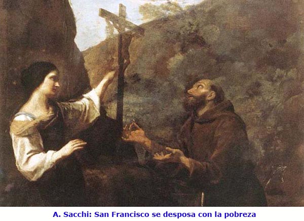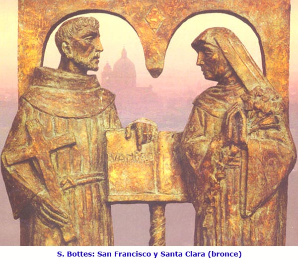 CASTIDAD Y AMISTAD[7] Se supone que las dos mujeres que conocía Francisco de vista eran Jacoba de Settesoli y la hermana Clara. Y ¡con qué viril afectuosidad supo corresponder Francisco al amor de esas dos hijas espirituales! Fray Jacoba, como usaba llamarla el santo por su estilo de gran señora y por la naturalidad con que alternaba con los hermanos, tenía veintidós años cuando hospedó a Francisco por primera vez en Roma en 1212. Entre ambos se creó una amistad muy estrecha; era considerada como unida espiritualmente a la fraternidad, como un hermano más. Con ella no rezaba la prohibición de admitir mujeres en el recinto de la Porciúncula, reservado a habitación de los hermanos (LP 8). De la amistad con santa Clara hay datos abundantes y muy significativos, si bien no todos resisten al rigor de la crítica. Contaba Clara diecisiete años cuando Francisco, doce mayor, cautivó su espíritu con el ardor de su predicación y la inflamó en el amor a Cristo crucificado. Bona de Guelfuccio recordaría, en el proceso de canonización, aquellas citas furtivas, muy arriesgadas, dadas las costumbres de la época, cuando Clara, acompañada de su amiga, salía secretamente de casa e iba a encontrarse con Francisco, quien la esperaba en lugar bien disimulado, acompañado, a su vez, de fray Felipe, uno de los primeros seguidores, de quien dice Celano que «el Señor le purificó los labios con el fuego de la castidad» (cf. 1 Cel 25). En coloquios llenos de unción espiritual, a media voz, Francisco estimulaba a Clara «a volverse a Jesucristo» sin reserva.[8] Así, en encuentros amparados en la pureza de las intenciones, quedó sellada aquella unión de dos espíritus hechos el uno para el otro. El amor de Clara a Francisco se mantendría en el plano de una adhesión filial, rendida y ardorosa, siempre espiritual, sin dejar de ser auténticamente humana. Una vez canonizado el Padre amadísimo (1228), se abandonaría a ese amor con una intensidad mayor, hecha devoción. Nada más revelador que el sueño singular que un día refirió con sencillez a las hermanas y que éstas hicieron constar en todo su ingenuo realismo en el proceso de canonización (Proc 3,29; 4,16; 6,13; 7,10). Y el amor de Francisco, sin dejar de ser amor de Padre, tendría mucho del entusiasmo legítimo por el frescor y la tenacidad con que vio prender en el corazón de la que gustaba llamarse su «plantita», el ideal del seguimiento de Cristo por la vía de la pobreza y de la sencillez. La trataba como a colaboradora en la misma aventura evangélica. Aunque no sea más que por su valor simbólico, indicador del recuerdo dejado en la familia franciscana por el noble afecto de los dos santos fundadores, no está de más hacer mención del relato de las Florecillas sobre el banquete espiritual tenido en la Porciúncula (Flor 15). En un principio Francisco iba con frecuencia a conversar con las damas pobres. Pero más tarde la espontaneidad primera hubo de ceder a una mayor sobriedad en las visitas y en la forma del trato, debido, en parte, al tenor cada vez más monástico que fue adoptando el conventito de San Damián, bajo la autoridad de Hugolino, en parte también porque los hermanos de la Porciúncula no siempre supieron comportarse con la debida discreción. El fundador tenía que dar ejemplo. Y explicaba a sus compañeros: