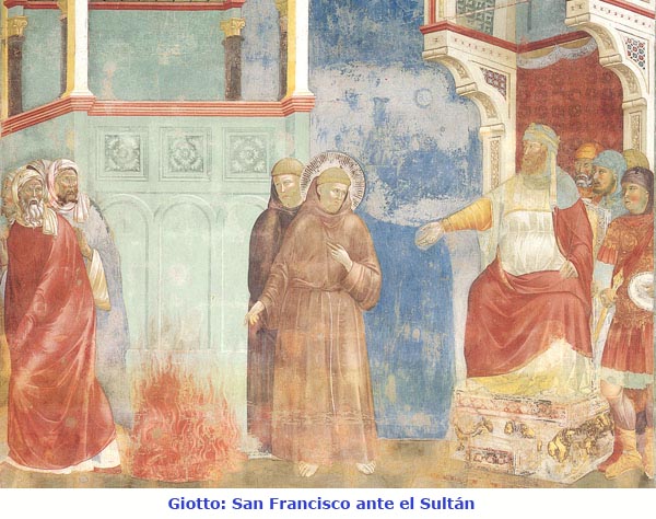 SIGNIFICADO DE LOS VIAJES DE FRANCISCO Sorprende la rapidez con que Francisco fue adquiriendo conciencia del destino de la fraternidad en un radio de acción cada vez más universal. El hecho de haber descubierto su vocación evangélica a la lectura de la página de la misión, le hizo ver cada vez más el mundo entero como el campo de la vida y del mensaje de los hermanos menores, «salidos del mundo» y aligerados de los bienes de la tierra precisamente para «ir por el mundo» o, como escribirá al final de su vida en la carta a la Orden, «enviados al mundo entero para dar testimonio, de palabra y de obra, de la voz de Dios» ante todos los hombres (CtaO 9). Debió de ser a fines de 1212 cuando el fundador intentó por primera vez encaminarse al Oriente, cuando la fraternidad contaba tres años de existencia. El viaje fracasó. Siguió otro intento, al año siguiente, por la vía de Occidente, para ver de acercarse a los moros de España, recién derrotados por los príncipes cristianos en la importante batalla de las Navas de Tolosa. Nuevo fracaso: enfermó y hubo de regresar a Italia (1 Cel 55-56). Por fin, en 1219, Francisco logró que la fraternidad, reunida en capítulo, programara en serio la evangelización de los infieles. Se formaron cuatro grupos de misioneros; tres de ellos tenían como destino llevar el mensaje de paz a los tres frente donde entonces se localizaba la contienda de cristianos y musulmanes: uno tomaría la ruta de Marruecos a través de España; el otro, dirigido por Elías, se dirigiría a Siria; y el tercero, bajo la guía personal de Francisco, atravesaría el mar hacia Egipto, donde el ejército cristiano tenía sitiada Damietta. El cuarto grupo, dirigido por el hermano Gil, tenía como objetivo el centro mercantil de Túnez. Puede afirmarse que ningún hecho de la vida del santo está tan abundantemente documentado ni tan objetivamente atestiguado como la visita al sultán Melek-el-Kamel. Además de Celano, Jordán de Giano y san Buenaventura, que tuvo como informador a fray Iluminado, compañero de viaje de Francisco en esa ocasión, han dejado relatos particularizados dos testigos presenciales extraños a la Orden: el obispo Jacobo de Vitry y el cronista Ernoul.[2] Para comprender el sentido de los viajes misioneros de Francisco, en especial su encuentro con el Sultán, hay que prescindir tanto de la interpretación dada por los biógrafos de la Orden, que lo presentan como un fracaso, ya que el santo no logró ni convertir al soberano musulmán ni conseguir el martirio, como asimismo de la interpretación en clave de cruzada, presente en las otras fuentes; hay que dejar de lado, además, los complementos legendarios. Y lo que queda es la sucesión de los hechos en sí mismos.[3] Fiel a su consigna minorítica de no prevalerse de recomendaciones ni de cartas de protección, Francisco no va entre los infieles en nombre de nadie, no lleva embajada alguna ni de papa ni de rey. El cardenal Pelagio, que acababa de llegar como legado del papa con un ejército de refuerzo, lejos de apoyarle en su intento, le encareció que tuviera cuidado de no comprometer los intereses de la Cristiandad. Va él mismo, como hombre, como cristiano. «¡Soy cristiano, llevadme a vuestro Señor!», dice a los soldados del sultán cuando le echan mano. Y se presenta ante el soberano como ante un hombre, que tiene otra fe, sin tener en cuenta que se trata del jefe del otro bloque enemigo, sin acomplejarse ante el fausto oriental de que se halla rodeado; y entabla el diálogo de hombre a hombre, persuadido de que el sultán, como cualquier otro hombre, busca con rectitud el camino de la salvación. Todas las fuentes concuerdan en el éxito fundamental de la visita: Francisco se ganó la simpatía y el afecto del sultán. Jacobo de Vitry añade que, al despedirle con todos los honores, le dijo: «Ruega por mí, para que Dios se digne revelarme la ley y la fe que más le agrada».[4] Francisco no regresó a Italia con la impresión de que su aventura inaudita hubiera sido un fracaso. Queda, ante todo, el valor simbólico del hecho en sí mismo, como testimonio profético de reconciliación y de paz. El verdadero éxito fue el haber sintonizado espiritualmente con ese jefe musulmán que, como atestiguan las fuentes cristianas, «era de condición suave y pacifica». A una crónica árabe debemos la noticia de que Melek-el-Kamel experimentó un fuerte cambio en sus sentimientos, bajo el influjo de un monje de gran santidad por nombre Fakr-el-Din Farisi (no es difícil ver en este nombre una deformación de Francesco d'Assisi).[5] Las negociaciones entabladas entre el sultán y el rey de Jerusalén Juan de Brienne, jefe militar de los cruzados, pudieron ser otro de los resultados del viaje de Francisco. Este rey se hizo más tarde hermano menor.[6] Al regreso, Francisco trajo consigo, además de la gracia de una nueva dolencia -el tracoma en los ojos que lo atormentaría hasta la muerte-, el descubrimiento de valores religiosos entre los seguidores de Mahoma. Había cosas que podían servir de modelo a los cristianos, por ejemplo aquel postrarse en adoración varias veces al día a la voz del muecín desde lo alto de los alminares. En efecto, se hizo promotor, entre los gobernantes, de la práctica de invitar a todo el pueblo cristiano, en horas determinadas, a son de campana o por medio de pregón, a tributar alabanzas a Dios (CtaA 7-8; 1CtaCus 8).