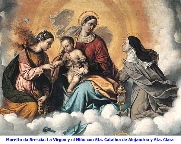 No sorprende esta fertilidad en árbol que tiene franciscana la raíz. Desde la difusión del cristianismo en los primeros siglos, durante el período apostólico, ningún hecho de conciencia universal puede compararse al del movimiento franciscano en el siglo XIII. Corriente honda y ancha transformó la sociedad, llevó por cauces nuevos el arte, la historia, la vida moral de muchas generaciones. Por medio de Santa Clara, la influencia de San Francisco de Asís se transmitió a la mujer. La mujer está siempre dispuesta al entusiasmo y al proselitismo. Los mismos sectarios encuentran en ella fácil adhesión. En la mujer y en el pueblo cundió, durante la Edad Media, la mendicidad de los valdenses, el puritanismo de los cátaros y el panteísmo místico de los begardos; y si de tal manera sintieron el tempestuoso oleaje de la devoción independiente, no es mucho que sintiesen el aura franciscana, soplo de fuego que levantó tal incendio en el mundo. La vida seráfica y extraordinaria de San Francisco: su intensa caridad; su afectuosa relación con la Naturaleza; los prodigios que en él y por él obraba el amor; la dulce poesía y el soñador regocijo con que practicaba el Evangelio, eran llamada y señuelo para la imaginación y el corazón de las mujeres. Innumerables le seguían cuando predicaba; alguna había de pensar en imitarle. La primer oveja que acudió al silbo del pastor fue una doncella de muy noble prosapia, Clara Schiffi, hija de los condes de Sassorosso. Era de Asís, el mismo pueblo de San Francisco; llevaba, como él, un nombre nuevo, jamás impuesto a nadie en la pila, y tenía doce años menos, contando dieciséis cuando le oyó predicar en la Catedral por vez primera, cercado del prestigio que ya rodeaba al milagroso fratello, amado de los humildes y capaz de convertir hasta a los lobos. Ya antes de oírle sentía Clara, niña aún, los impulsos del sacrificio y de la perfección, las ansias del cielo. Elegida para ser saludada por la Iglesia con el título de Matris Deo vestigium, «imagen de la Madre de Dios», nada malo ni ruin cupo en su noble espíritu. Sus padres querían casarla, y andaban entendiendo en los preparativos de boda, cuando la presencia y la voz del Pobrecillo decidieron la verdadera vocación de la joven Clara. Derecha se fue a San Francisco y le ofreció toda su vida. San Francisco aceptó. La mañana del domingo de Ramos vistióse Clara sus galas mejores para recibir en la Catedral de Asís la palma de manos del Obispo. Al recoger la rama seca y amarilla, de pronto vio que recobraba su color verde, como si acabasen de cortarla. La misma noche, sin despojarse del rico traje y de los joyeles y adornos, salió secretamente por una poterna del palacio, apartando con sus débiles brazos las vigas y trozos de sillar que la obstruían. Dirigióse a la Porciúncula, que estaba iluminada; Francisco y sus hermanos rezaban laudes. Quitóse Clara al entrar su manto negro, y la claridad de los cirios destelló en el oro y recamos de su brial, en las pedrerías de sus orejas y garganta. Arrodillándose, comenzó a arrojar al pie del ara las perlas, a arrancarse los cintillos, a desprender las flores de su cabeza de dieciocho años. La mata del pelo rubio cayó sobre sus hombros; rechinaron las tijeras, y Francisco suspendió la suave crencha a los pies de la Virgen. En seguida vistió a Clara la grosera túnica, la cuerda de nudos, los dos velos, blanco el uno como la castidad perenne, negro el otro como la soledad perpetua. Y mientras la esposa de Cristo pronunciaba los votos, los franciscanos cantaban el epitalamio de las divinas bodas. ¡Cuántas veces se ha reproducido esta escena significativa y solemne! ¡Qué de cabelleras han caído al pie del altar desde aquel día! Los padres de Clara se mostraron sorprendidos y enojados, y su desagrado se convirtió en furor cuando de allí a dos semanas la hermana menor de Clara, Inés, capullo de quince años, corrió a reunirse con la mayor, resuelta a seguir igual suerte. Por entonces la parentela de los nobles era una especie de guardia militar. Los deudos de las familias de Schiffi y Fiume, capitaneados por el tío de las novicias, se dirigieron al monasterio del Santo Ángel a recobrarlas por fuerza. Cogieron en brazos a Inés, pero su esbelto cuerpecillo pesaba de tal modo, que entre doce hombres no pudieron llevarla. Llamaron en su ayuda a unos viñadores, y los gañanes, rendidos, desistieron de la empresa, exclamando atónitos: «Para que tanto pese la niña, es menester que toda la noche haya comido plomo». No es posible torcer por la fuerza una voluntad determinada y firme, ni ahogar una vocación. Antes se haría al agua remontar su curso y desmentir su nivel natural. Clara, desde el primer instante, por la misteriosa ley del corazón femenino que adivina y se asimila el sentimiento y la fe en sus más íntimos aspectos, había adivinado al Pobrecillo, abrazando e interpretando su ideal. Defensora incansable de aquella Dama Pobreza con quien San Francisco se había desposado, Clara fue la franciscana genuina de la edad de oro de la Orden. Instalada en la ermita de San Damián, sitio donde las azucenas franciscanas crecían solas, jamás quiso aceptar bienes ni poseer cosa alguna, ni aun con dispensa pontificia, y respondió enérgicamente a Gregorio IX, que era su grande amigo y admirador: «Padre Santo, absuélveme de mis pecados, pero no me dispenses de seguir a Cristo». A ruegos de Clara, en las últimas horas de su vida mortal, Inocencio IV escribió de puño y letra la bula de perpetua pobreza para las Clarisas. Imitando también a San Francisco en esto, Clara ansiaba el viaje a tierra de infieles para ser allí martirizada. En poco estuvo que lo consiguiese sin salir de la Umbría cuando Federico II, el gibelino, arrojó sus alárabes sobre la ciudad güelfa de Asís. Al oír los gritos feroces de los paganos, Clara tomó la custodia, abrió las puertas del convento y salió al encuentro del